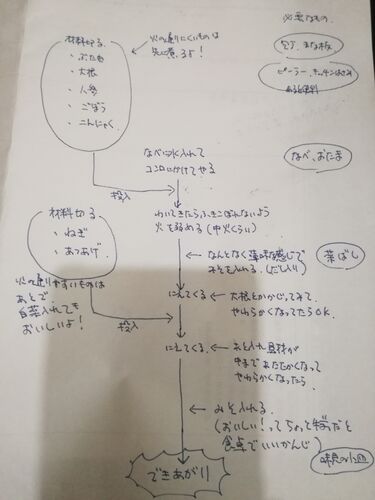 先日、ツイッターでとん汁作成の際のフロー図を上げてみたのですが、意外に好評で「従来のレシピ」を読み解くのに困難を感じている人って意外に多いのかもなぁ、などという感想を持ちました。ワタシは文章が優位に把握できるタイプですので、フロー図の方が…